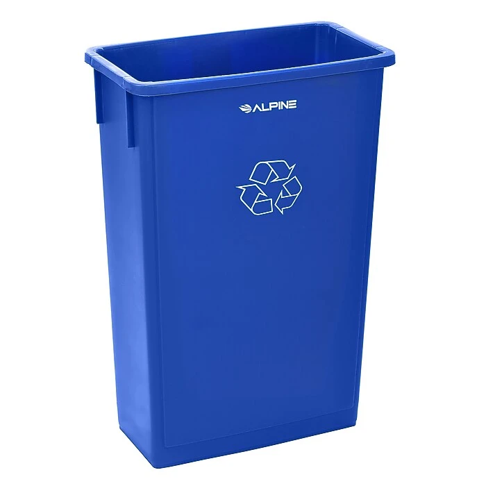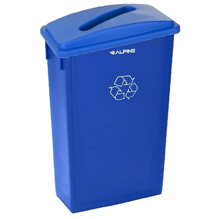 Alpine Industries 23 Gallon Blue Slim Recycle Bin stylish and compact, making it easy to fit into any office or commercial space. This gray trash can features a large and clear black print label, making it a noticeable trash disposal solution even from far away. The lid is designed to insert paper, envelopes and the like. Use to recycle or hide rubbish with this 1 slot lid. The trash can and lid are conveniently designed for function and can handle a beating.