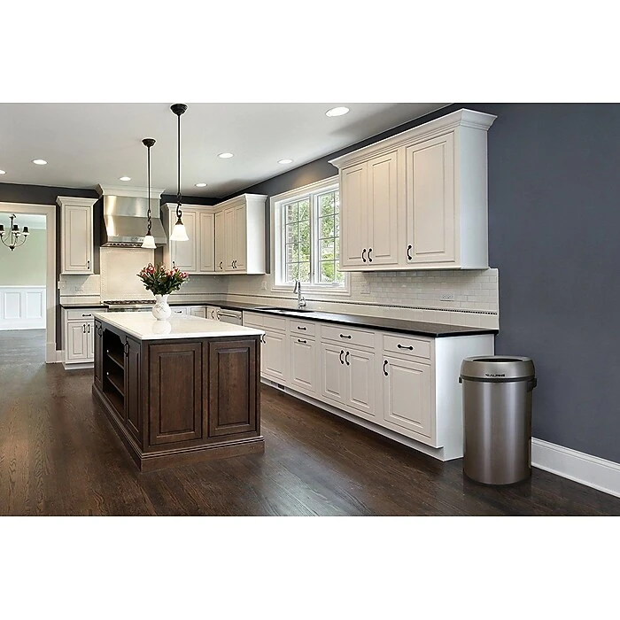 - CLEAN, MODERN STYLE. Featuring a brushed silver finish with black handles – along with black rings on both the top and bottom – this sleek, stainless steel garbage can adds a clean, modern look that will easily fit into any interior space.