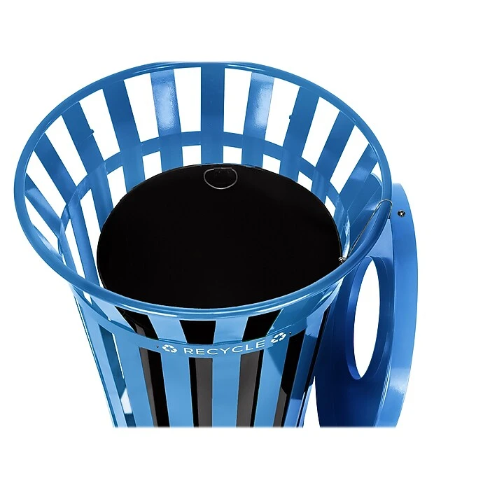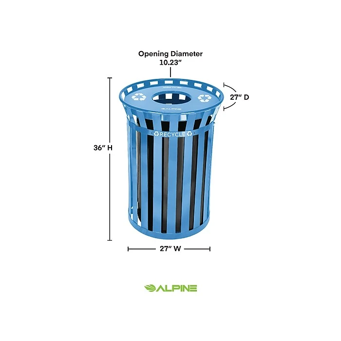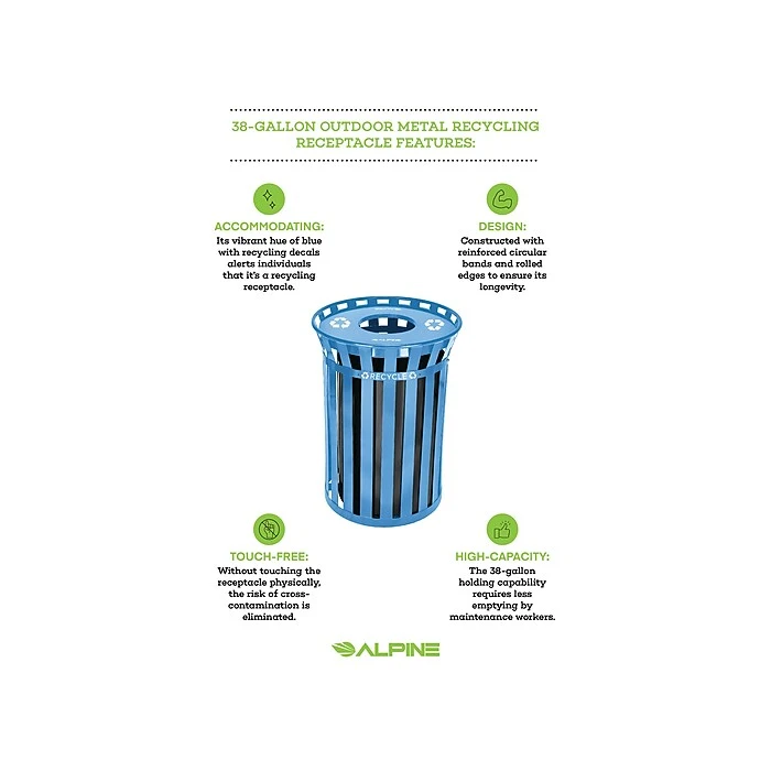Outfitting your outdoor property with stable recycling receptacles is imperative to eliminate litter. A practical and resilient option is the Alpine outdoor metal recycling receptacle. The receptacle features a substantially sized holding capacity of 38 gal. that requires less emptying by your maintenance staff. This bin includes a retaining cable to ensure effortless removal of the metal liner. The body of the receptacle is constructed with reinforced circular bands and rolled edges to guarantee it can handle daily wear and tear in all weather conditions. This Alpine receptacle is excellent for parks, walking trails, recreational fields, outside offices, schools, and so much more. On the top of the lid are two white recycling symbols located on each side of the receptacle, alerting individuals it’s designated for recycling. The polyester powder coating is perfect for outdoor use as it provides superior coverage, a polished finish, and it detracts vandals. Additionally, the powder coating provides weather resistance, so there is no fear of degrading color or finish.