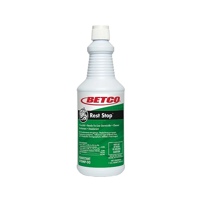 The Betco Rest Stop ready-to-use, acid-free restroom cleaner is an excellent multipurpose germicidal detergent that disinfects, cleans, and deodorizes in one easy step. Formulated with a combination of builders, this product offers excellent cleaning performance on a wide variety of restroom environmental surfaces. Providing outstanding value and economy, it’s floral fresh fragrance is long-lasting for superior odor control.