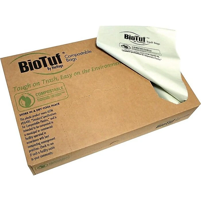 Take garbage out to the dumpster easily with these compostable resin green trash bags. Featuring a star-sealed bottom and sturdy material, these trash bags help prevent leaking, so you can dispose of waste with confidence, and the coreless design provides simple, quick dispensing. These BioTuf compostable trash bags are made to fit garbage receptacles with a 33-gallon capacity for added versatility.