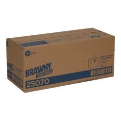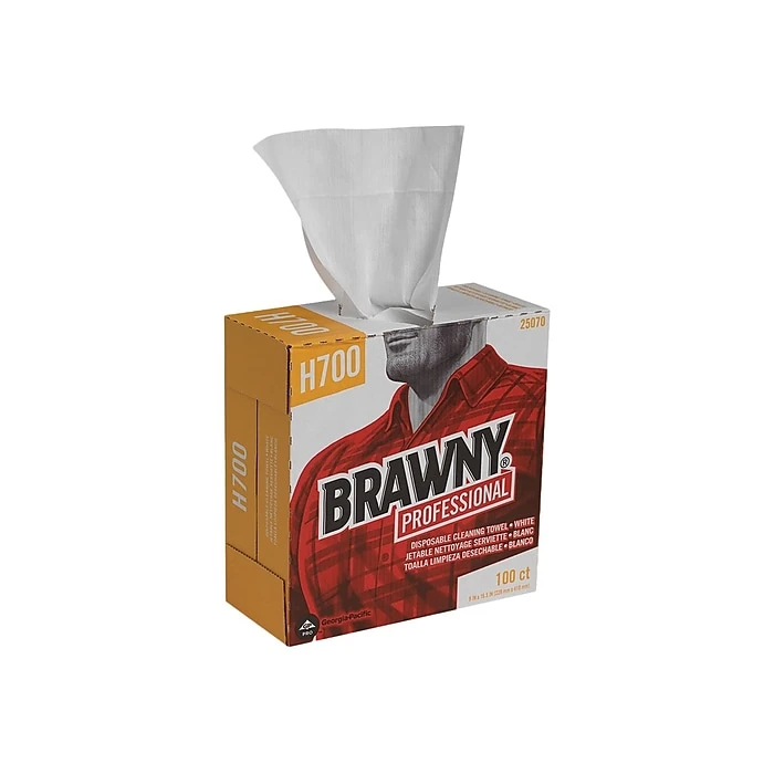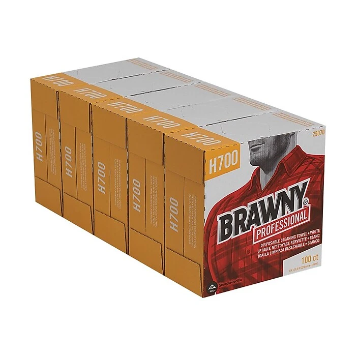 Wipe up spills and drips or clean up a soiled area with harsh commercial solvents using these durable tear-resistant towels. Each box contains 100 reusable, low-lint cloth towels, so you always have some available. This case includes five wall-mountable boxes of Brawny shop towels for convenient stocking in various areas of your facility, and the pop-up dispensing makes one-handed access simple.