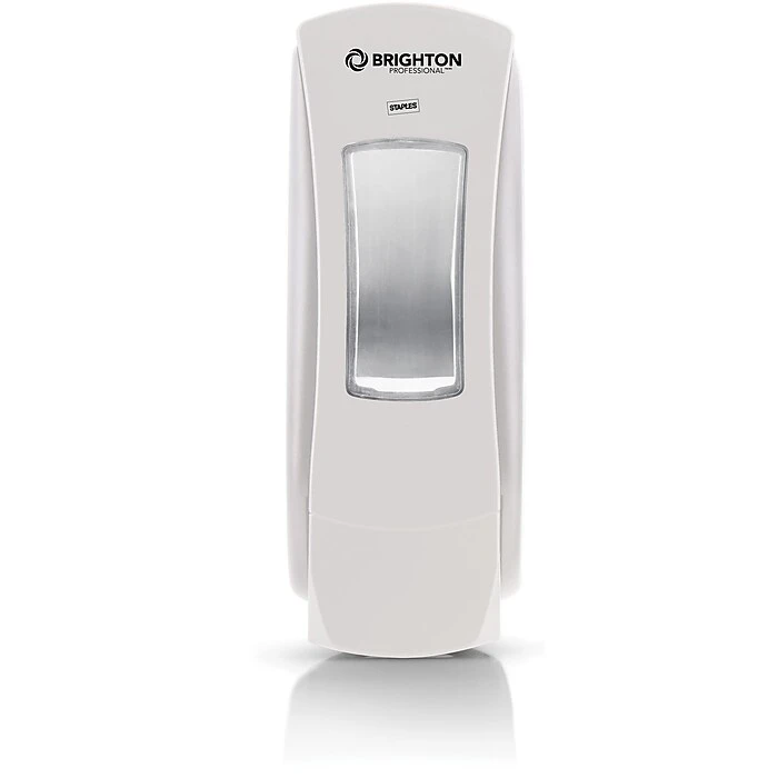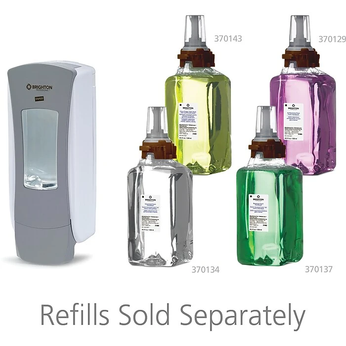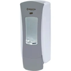 The Brighton Professional white/gray foam soap dispenser measures 11 4/5″ x 4 3/5″ x 3 9/10″ and has an optional key lock for safety. The dispenser features one-hand-push operation and can hold the contents of a 250 ml. sealed refill.