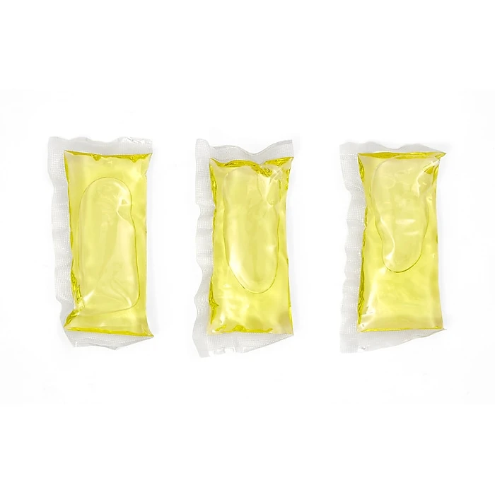 - Water-soluble, portion-controlled packets of liquid concentrate chemical