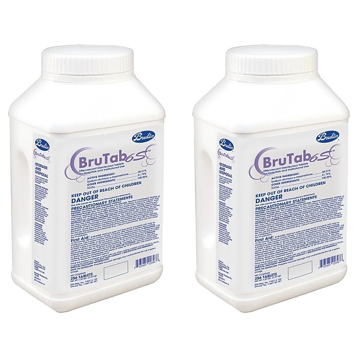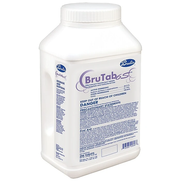 Bleach alternative in effervescent tablet form. The Brulin BruTab 6S tablet is strong, user-friendly, stable, sustainable, simple, and smells clean. Effective against a broad range of microorganisms, including C. difficile spores, hepatitis B, norovirus, and canine parvovirus. Each single-dose tablet delivers accurate strength solution every time, eliminating measure and pour guesswork.
