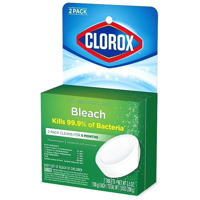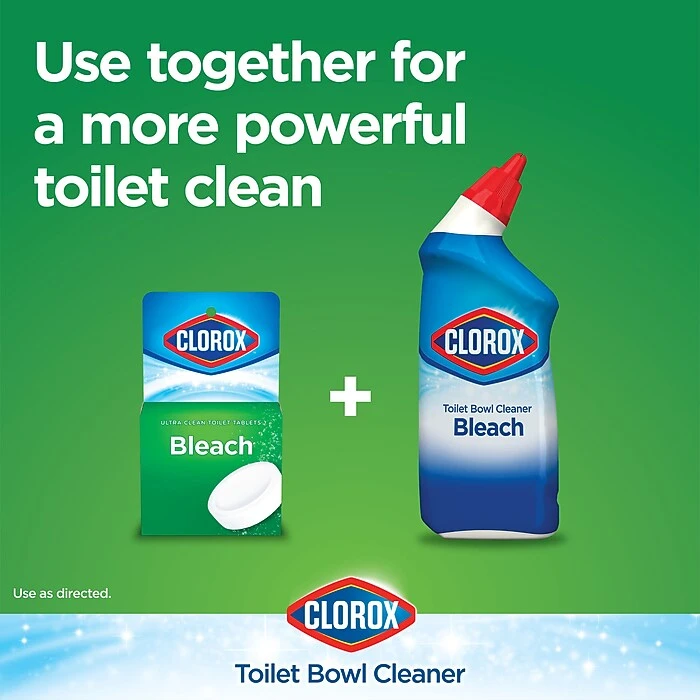 Cloroxâ„¢ Ultra Clean Toilet Tablets kill 99.9% of bacteria and deodorizes your toilet with the power of Cloroxâ„¢ bleach. This toilet bowl cleaning tablet, effectively cleans and prevents stains with each flush, eliminating the need to scrub every time. Each tablet delivers a long-lasting bleach clean and is good for up to 3 months. Simply drop a tablet into your toilet tank to continuously sanitize, deodorize and clean your toilet every time you flush. The dissolvable cleaning tablets help prevent tough stains and removes hard water, mineral deposits and limescale stains. Ideal for use in restaurants, cafeterias, offices, hotels, daycares and other commercial facilities. Keep your toilet bowl sparkling fresh and ultra clean with no mess and no fuss with the help of Cloroxâ„¢ Ultra Clean Toilet Tablets.