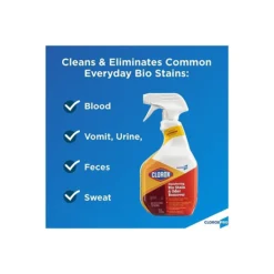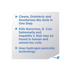 CloroxProâ„¢ Disinfecting Bio Stain & Odor Remover disinfects and removes the toughest odors and stains in one step. This bleach free stain and odor remover uses hydrogen peroxide technology to kill HIV, herpes, and flu virus in 30 seconds, kills hepatitis B and hepatitis C in 1 minute, and kills norovirus, E. coli, Salmonella and MRSA in 5 minutes. It meets EPA criteria for use against SARS-CoV-2, the virus that causes COVID-19. Compliant with OSHA Bloodborne pathogens standard, Disinfecting Bio Stain and Odor Remover works on stains from blood, feces, vomit, sweat, saliva, and urine. This versatile disinfectant can be used to clean many different hard and soft surfaces such as walls, tile, grout, concrete, carpet, fabrics, upholstery, toilets, counter tops, mattresses, and it can even be used as a pre treatment for laundry. Ideal for hotels, care centers, schools, offices, restaurants and other commercial facilities. CloroxProâ„¢, where clean means everything. Packaging may vary.