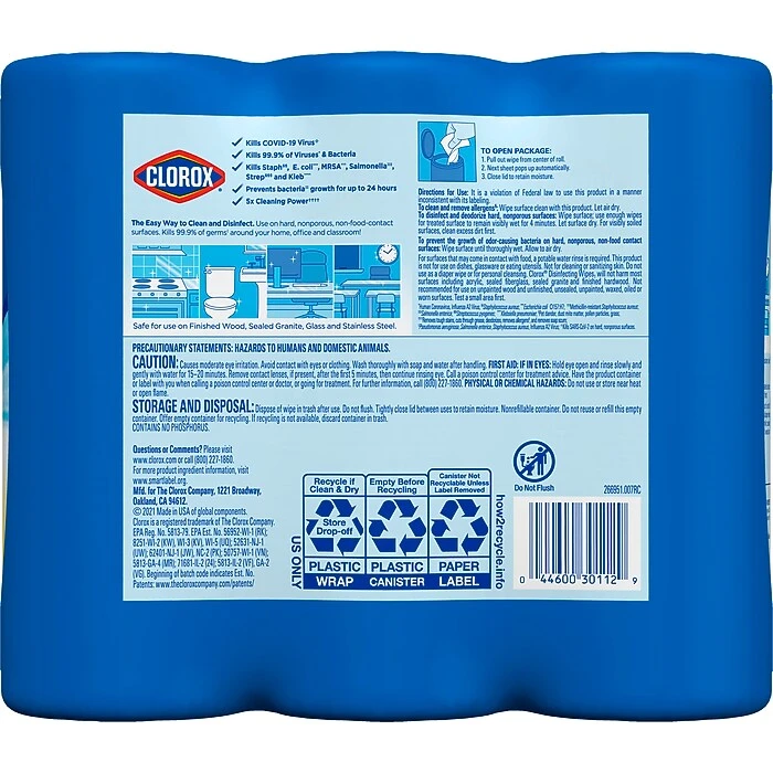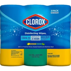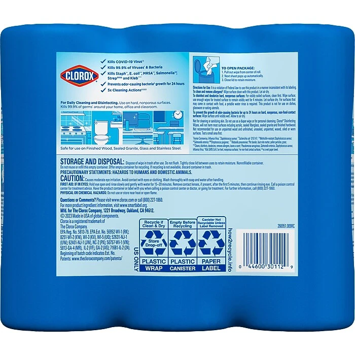 Clorox® Disinfecting Wipes clean, disinfect, deodorize and remove allergens for 5x Cleaning Power and leave a pleasant scent. Disinfecting Wipes clean and disinfect with antibacterial power that kills 99.9% of viruses and bacteria that can live on surfaces, including COVID-19* Virus, staph, E. coli, MRSA, salmonella, strep and Kleb. These all-purpose disposable wipes remove common allergens, germs and messes on surfaces like kitchen counters, bathroom surfaces and more and can prevent the growth of bacteria* for up to 24 hours. Wipes are safe to use on finished wood, sealed granite and stainless steel. Disinfecting Wipes are also great on non-food-contact surfaces in the home, office, classroom, pet area, dorm and locker room. Clean with bleach-free wipes to keep dirt and germs away. *Kills SARS-CoV-2 on hard, nonporous surfaces; *odor causing bacteria on non-food contact surfaces
