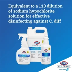 Healthcare professionals trust Clorox Healthcare® Bleach Germicidal Cleaner to help them overcome infection control challenges in a constantly changing healthcare environment. Clorox Healthcare® Bleach Germicidal Cleaner is a ready to use, 1 step cleaner- disinfectant containing a 1:10 bleach dilution to meet CDC and OSHA guidelines for disinfecting surfaces in healthcare settings. This cleaner disinfectant is EPA registered to kill a total of 50 microorganisms, including HAI causing bacteria like MRSA and VRE, outbreak causing viruses such as Influenza A and B viruses, Measles Virus and Norovirus and fungi in 1 minute. This disinfectant kills 99.9999% of C. difficile (C. diff) spores in 3 minutes, according to the current EPA recommended testing standard (June 2014). In addition, this cleaner meets EPA criteria for use against SARS-CoV-2, the virus that causes COVID-19. The ready-to-use disinfectant eliminates compliance risks and labor costs associated with dilutable disinfectants. Designed for easy refilling to meet needs of heavy users. This bleach solution features an anticorrosion agent and is formulated for broad surface compatibility with healthcare surfaces including stainless steel, glass, plastic, porcelain, glazed ceramic, laminated surfaces and vinyl. Intended for use in Healthcare settings.