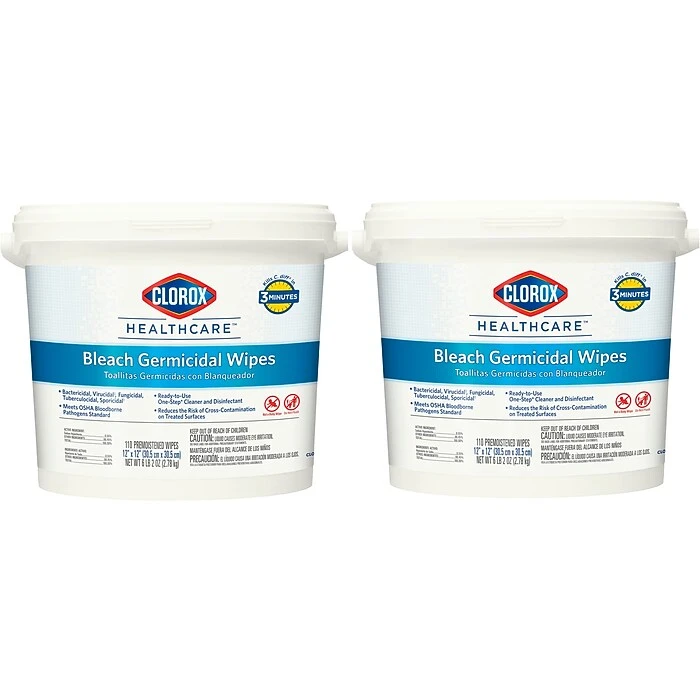 Healthcare professionals trust Clorox Healthcare® Bleach Germicidal Wipes to help them overcome infection control challenges in a constantly changing healthcare environment. Clorox Healthcare® Bleach Germicidal wipes are ready to use, 1 step cleaner containing a 1:10 bleach dilution to meet CDC and OSHA guidelines for disinfecting surfaces in healthcare settings. Designed for discharge disinfection, large areas. These terminal wipes are EPA registered to kill a total of 58 microorganisms, including HAI causing bacteria like MRSA and VRE in 30 seconds, outbreak causing viruses such as Influenza A and B viruses, Measles Virus and Norovirus in 1 minute and C. difficile (C. diff) spores, TB and fungi in 3 minutes. These wipes kill 99.9999% of C. difficile (C. diff) spores, according to the current EPA recommended testing standard (June 2014). And they meet EPA criteria for use against SARS-CoV-2, the virus that causes COVID-19. These wipes are engineered minimize residue and leave less visible residue on surfaces vs. competitor bleach wipes. These ready-to-use wipes are formulated with an anticorrosion agent and are compatible with common healthcare surfaces including stainless steel, glass, plastic, porcelain, glazed ceramic, laminated surfaces and vinyl. Intended for use in Healthcare settings.