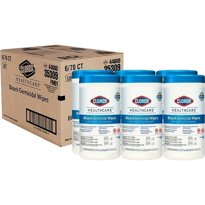 Healthcare professionals trust Clorox Healthcare® Bleach Germicidal Wipes to help them overcome infection control challenges in a constantly changing healthcare environment. Clorox Healthcare® Bleach Germicidal wipes are ready to use, 1 step cleaner containing a 1:10 bleach dilution to meet CDC and OSHA guidelines for disinfecting surfaces in healthcare settings. Designed for discharge disinfection, large areas. These terminal wipes are EPA registered to kill a total of 58 microorganisms, including HAI causing bacteria like MRSA and VRE in 30 seconds, outbreak causing viruses such as Influenza A and B viruses, Measles Virus and Norovirus in 1 minute and C. difficile (C. diff) spores, TB and fungi in 3 minutes. These wipes kill 99.9999% of C. difficile (C. diff) spores, according to the current EPA recommended testing standard (June 2014). And they meet EPA criteria for use against SARS-CoV-2, the virus that causes COVID-19. These wipes are engineered minimize residue and leave less visible residue on surfaces vs. competitor bleach wipes. These ready-to-use wipes are formulated with an anticorrosion agent and are compatible with common healthcare surfaces including stainless steel, glass, plastic, porcelain, glazed ceramic, laminated surfaces and vinyl. Intended for use in Healthcare settings.