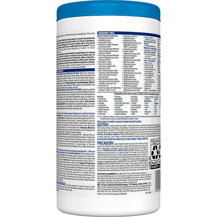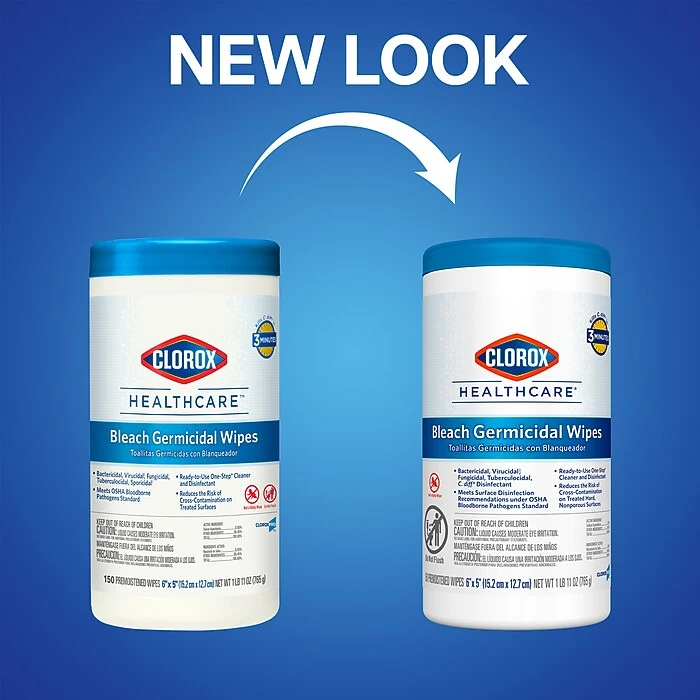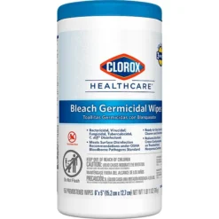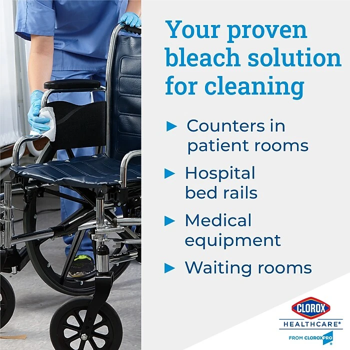 Healthcare professionals trust Clorox Healthcare® Bleach Germicidal Wipes to help them overcome infection control challenges in a constantly changing healthcare environment. Clorox Healthcare® Bleach Germicidal wipes are ready to use, 1 step cleaner containing a 1:10 bleach dilution to meet CDC and OSHA guidelines for disinfecting surfaces in healthcare settings. Designed for discharge disinfection, large areas. These terminal wipes are EPA registered to kill a total of 58 microorganisms, including HAI causing bacteria like MRSA and VRE in 30 seconds, outbreak causing viruses such as Influenza A and B viruses, Measles Virus and Norovirus in 1 minute and C. difficile (C. diff) spores, TB and fungi in 3 minutes. These wipes kill 99.9999% of C. difficile (C. diff) spores, according to the current EPA recommended testing standard (June 2014). And they meet EPA criteria for use against SARS-CoV-2, the virus that causes COVID-19. These wipes are engineered minimize residue and leave less visible residue on surfaces vs. competitor bleach wipes. These ready-to-use wipes are are formulated with an anticorrosion agent and are compatible with common healthcare surfaces including stainless steel, glass, plastic, porcelain, glazed ceramic, laminated surfaces and vinyl. Intended for use in Healthcare settings.