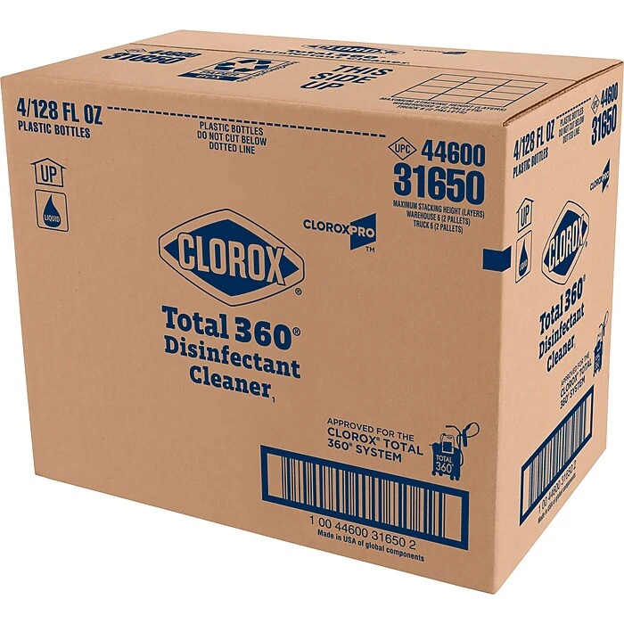 CloroxPro™ Total 360® Disinfectant Cleaner is designed to be paired with the Clorox® Total 360® Electrostatic Sprayer to clean, disinfect and deodorize. This disinfectant cleaner kills 99.9% of bacteria in 5 seconds and is EPA registered to kill 44 organisms including cold and flu viruses (Rhinovirus, Influenza A), Methicillin-resistant Staphylococcus aureus (MRSA), Norovirus, Salmonella enterica, Pseudomonas aeruginosa, Staphylococcus aureus (Staph) and Vancomycin-resistant Enterococcus faecium (VRE) in 2 minutes. The disinfecting cleaner meets EPA criteria for use against SARS-CoV-2, the virus that causes COVID-19. Safe to use on a variety of hard non-porous surfaces such as porcelain, stainless steel, tile, plastic, and other nonfood contact surfaces (when use as directed). It eliminates odors, inhibit the growth of mold and mildew for up to 7 days and sanitizes soft surfaces. CloroxPro™ Total 360® Disinfectant Cleaner is a bactericidal in the presence of organic soil (5% blood serum). Approved for use with the Clorox ® Total 360® Electrostatic Sprayer and intended for use with schools, athletic facilities, offices, healthcare facilities, public restrooms, hotels, airports, ambulances, daycare centers, and institutional kitchens. CloroxPro™, where clean means everything. Packaging may vary.