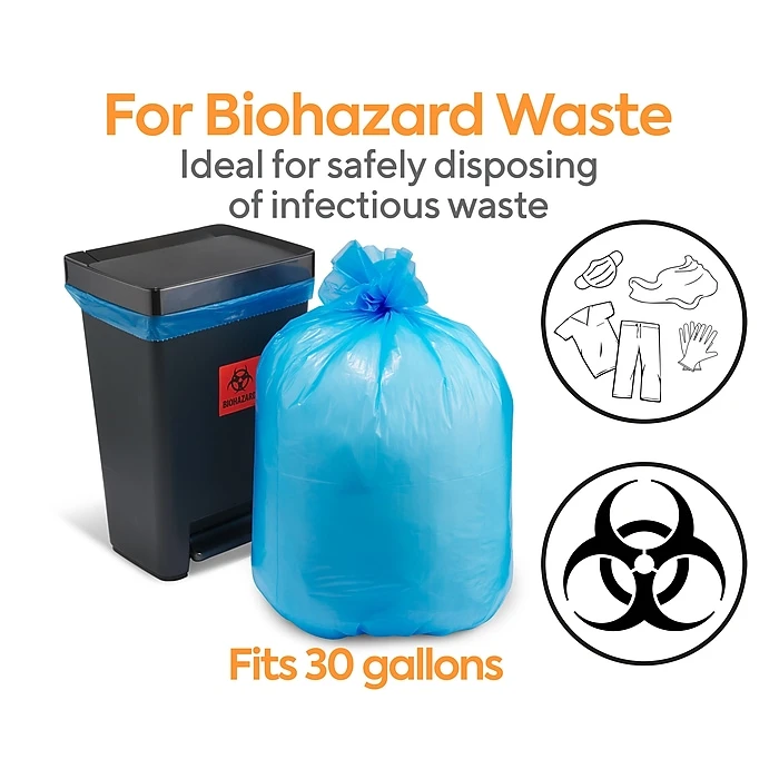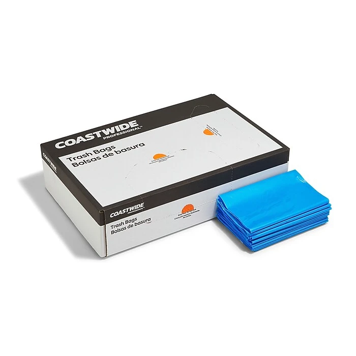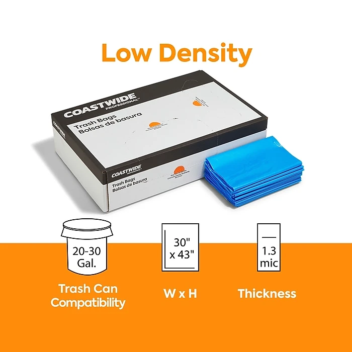 Keep medical facilities clean and sanitary with these 1.3-mil trash bags. The 20 to 30-gallon capacity lets you throw away plenty of waste before emptying, and the low-density plastic construction supports heavy and sharp items without stretching or tearing. These Coastwide Professional™ healthcare printed 20 to 30-gallon low-density trash bags are blue for easy visibility.