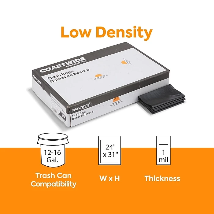 Keep workplaces free of office and food waste with these trash bags. The black coloring blocks refuse from sight, ideal for preserving privacy and disposing of sensitive materials. Low-density plastic resists stretching under the weight of heavy loads, and the tear-resistant design makes carrying sharp items easy. These Coastwide Professional™ black low-density trash bags fit in small garbage receptacles and hold up to 16 gallons of waste so you can go longer before emptying.