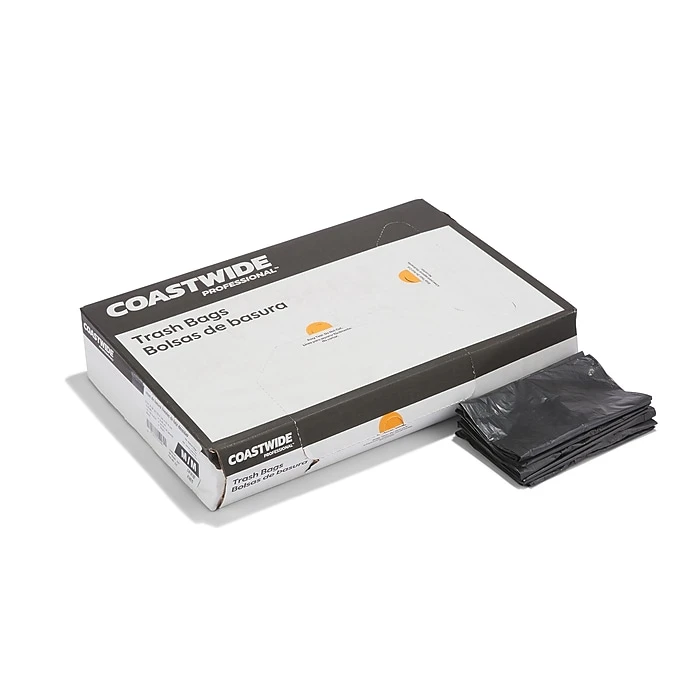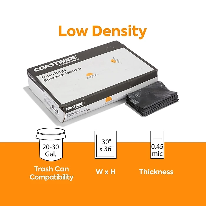 Maintain a clean, mess-free office with these unscented trash bags. The black color keeps the contents out of plain sight for discretion, and the low-density polyethylene prevents stretching to avoid leaks. These Coastwide Professional™ 0.45-mil trash bags hold 20 to 30 gallons of garbage, ensuring safe use in breakrooms, and the 250-count carton lets you handle the demands of a busy office.