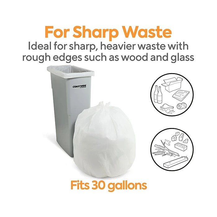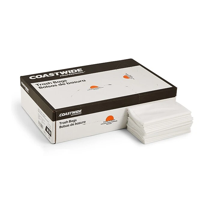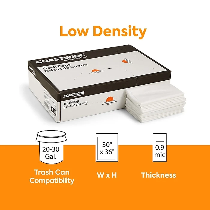 Dispose of heavy or wet items with these trash bags. White coloring conceals trash from sight, which is ideal for disposing of sensitive materials or personal items, and the low-density plastic resists stretching and tearing when carrying heavy loads. These Coastwide Professional™ white low-density trash bags have a 20 to 30-gallon capacity that holds plenty of garbage and extends the time between emptying and replacement.