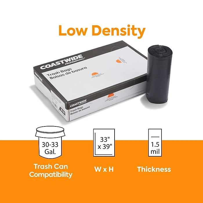 - Low-density and 1.5 mil thick bags keep heavy and wet trash and prevent it from stretching holes in the bag