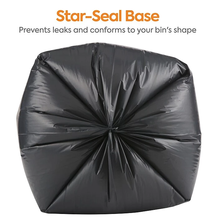 Keep your cleaning supply closet stocked with this 100-count carton of black trash bags. The dark color keeps contents discreetly hidden from sight, while the star-sealed bottom on each bag provides added protection against leaks. These Coastwide Professional™ black trash bags are crafted from low-density resin for enhanced puncture resistance, making them perfect for removing sharp objects from industrial sites.
