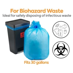 Ensure your workspace is safe from contamination with these biohazard trash bags. The blue color is easily visible to ensure cautious handling and opaque to hide the contents, and the 30-gallon capacity is compatible with industry-standard cans for a snug fit. These Coastwide Professional™ biohazard trash bags meet federal and state regulations for tear and dart impact resistance to ensure safe waste disposal.