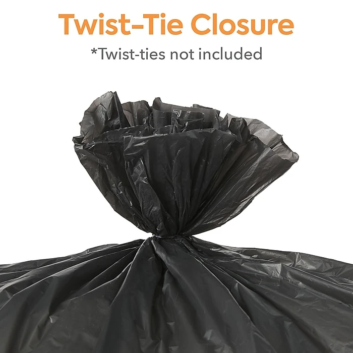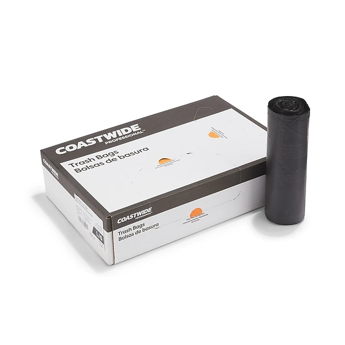 Contain your office waste securely in these black trash bags. The high-density polyethylene construction provides good lifting strength, while the star-sealed bottom distributes weight evenly to avoid leaks and tears. These Coastwide Professional™ trash bags hold up to 40 to 45 gallons of waste, making them suitable for breakrooms and offices, and come in a carton of 150, providing an ample supply.
