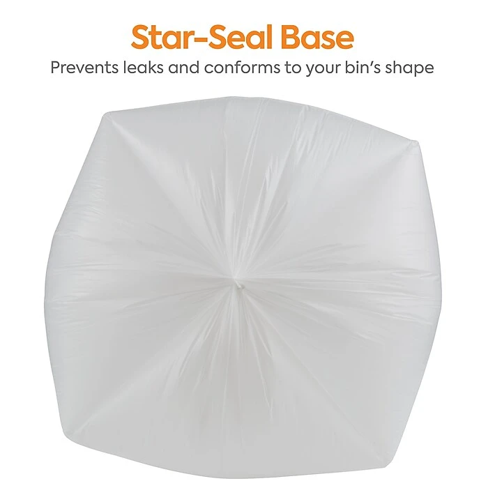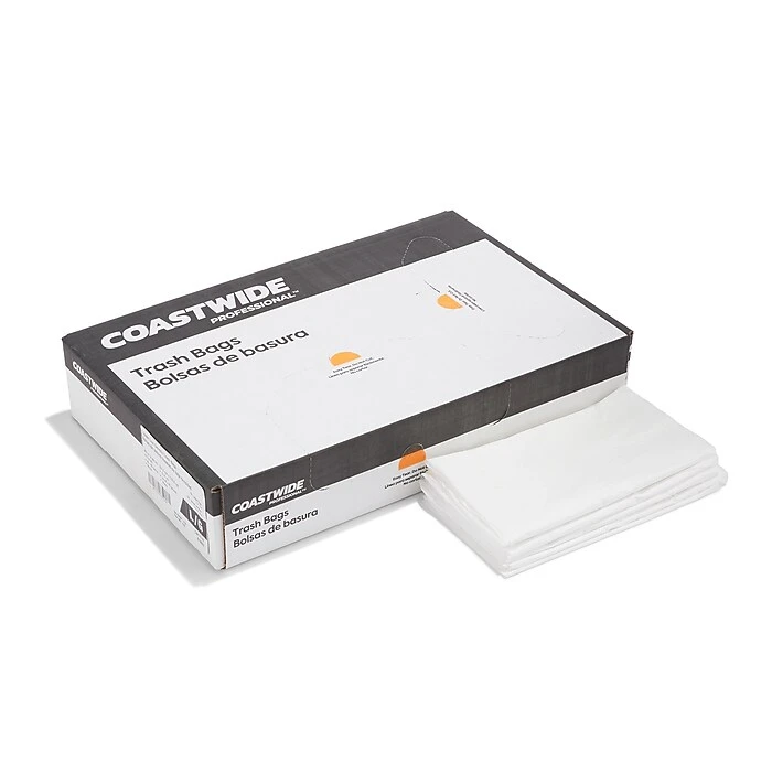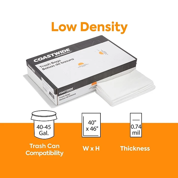 Keep your office clean with these trash bags. The 40 to 45-gallon size holds plenty of waste and fits in a variety of trash cans, and the low-density polyethylene construction resists tearing and stretching when containing heavy items. These white Coastwide Professional™ 40 to 45-gallon low-density trash bags have star-sealed bottoms that improve weight distribution and help prevent leaks.