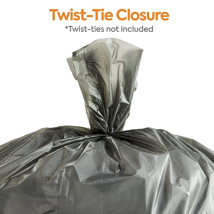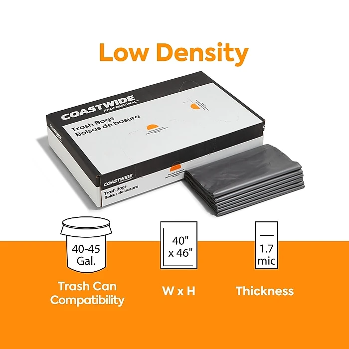 Maintain a safe, clean work environment with these sturdy trash bags. A star-sealed bottom keeps wet trash from leaking, and low-density polyethylene provides strength to resist punctures. With a silver-gray resin, these bags keep contents hidden from view for discretion. Versatile packaging lets these heavy-duty Coastwide Professional™ trash bags stack upright or sideways for convenient storage, and two dispensing options provide quick vertical or horizontal access.