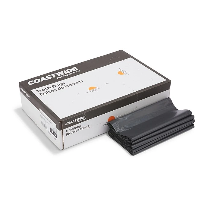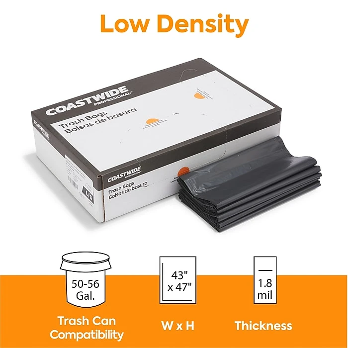 Enjoy versatility and efficiency with these low-density trash bags. Manufactured with prime resin, these garbage bags offer durability to handle large-scale cleanup tasks. The 56-gallon capacity and 1.8-mil thickness help contain liquids and prevent rubbish from poking through. A star-sealed bottom distributes refuse evenly for simple lifting and carrying. Boasting a top-side dual dispenser, these Coastwide Professional™ trash bags store vertically or horizontally for easy dispensing.