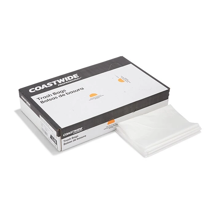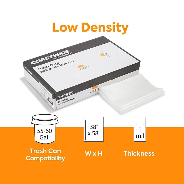 Prevent theft and accidental disposal with these trash bags. The low-density polyethylene material offers lasting durability and lets you dispose of heavy or sharp items without stretching or tearing. A transparent design makes identifying contents easy, which is ideal for preventing theft. Boasting a capacity of 55 to 60 gallons, these Coastwide Professional™ clear low-density trash bags fit easily in large receptacles and provide ample space for disposing of waste.