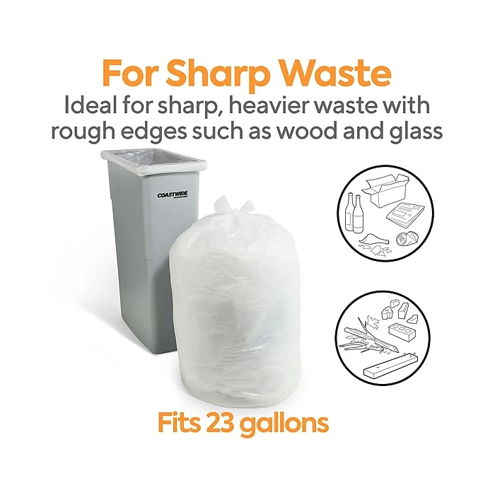 Get rid of refuse from the break room, washroom or other shared spaces with these AccuFit trash bags. The clear material delivers a view of the contents, helping prevent theft, while the low-density polyethylene prevents heavy items from stretching and ripping to avoid leaks, making them suitable for cafeterias and public areas. These Coastwide Professional™ AccuFit trash bags hold up to 23 gallons of waste as an effective maintenance solution.