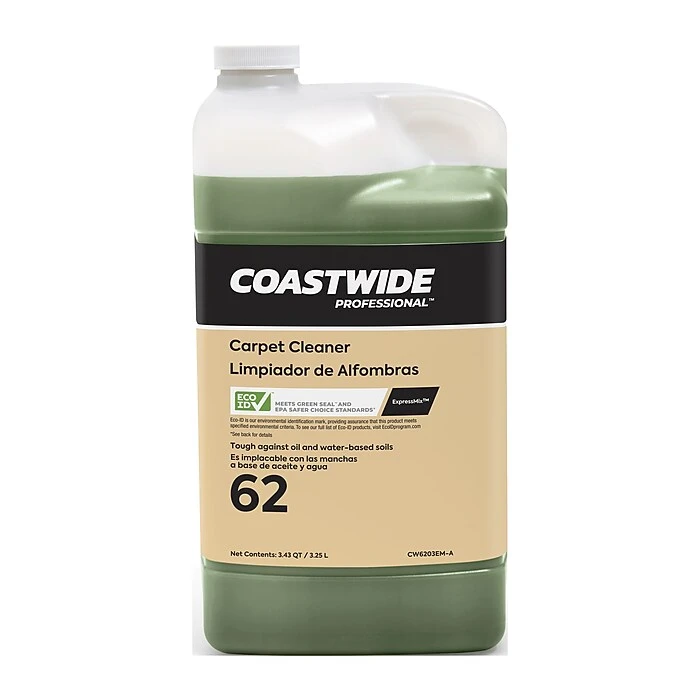 Penetrate carpet fibers to achieve a fresh, bright appearance with this carpet cleaner. The powerful formula removes water-based soils without leaving behind any sticky residue, and the highly concentrated formula is easy to dilute for use in a range of applications. This Coastwide Professional™ 62 Carpet Cleaner resists resoiling and works with ExpressMix wall-mount dispensers, providing a great option for bustling schools, private offices, and busy reception areas.
