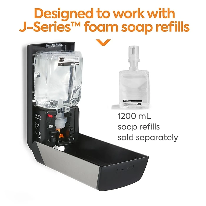 Make handwashing simple with this hands-free electronic soap dispenser. The adjustable output helps control consumption of J-Series foam soap to prevent waste, and the color-coded interior touchpoints make it easy for staff to refill. This Coastwide Professional™ J-Series automatic soap dispenser has a clear window for easy supply monitoring and a back-up manual dispense mode for when batteries run out, to ensure continuous service. Engineered to work with J-Series foam soap.