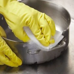 Clean countertops and basins with this light-duty scouring pad. A synthetic fiber construction is ideal for use on delicate surfaces, including china, ceramic and nonstick pans, leaving behind a scratch-free clean. The light abrasive surface gently removes leftover food and dirt. With 60 to a pack, this Coastwide Professional white light-duty scouring pad makes it easy to stock maintenance closets and dish rooms.