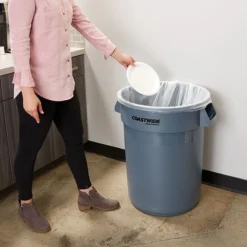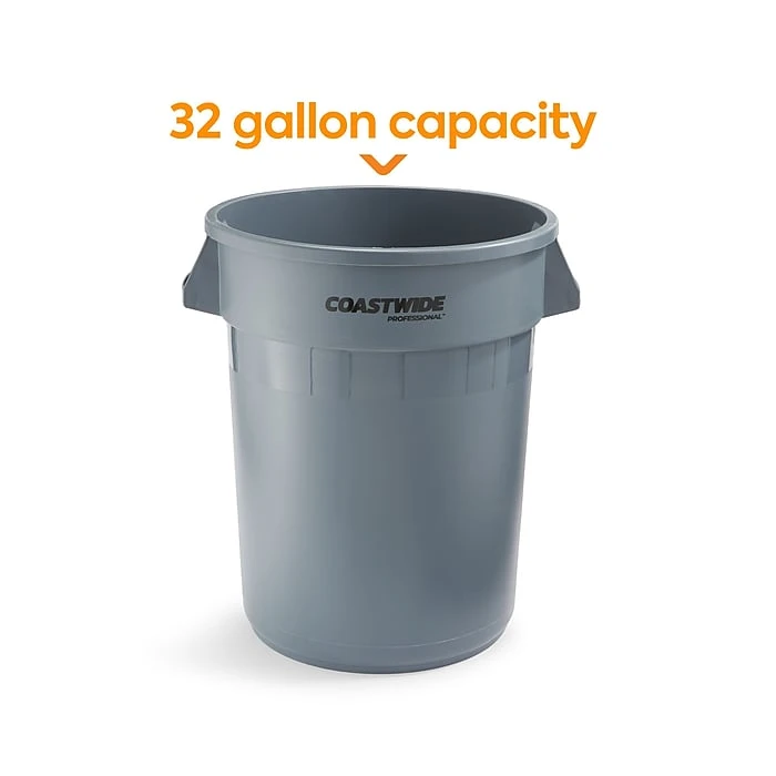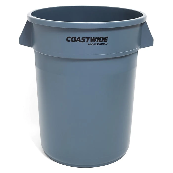 Make maintenance tasks simple with this durable 32-gallon trash container. Strong polyethylene construction handles heavier trash, making this waste receptacle ideal for use in break rooms and restrooms, while durable molded handles are easy to lift for quick emptying. This Coastwide Professional™ round gray trash container has a double ribbed base for extra reinforcement, and the nesting design is easy to stack when empty.