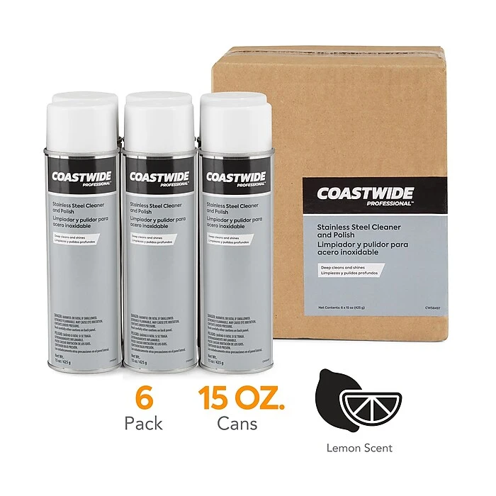 Provide an effective cleaning solution for janitorial staff with this stainless steel aerosol cleaner and polish. The color-coded label supports easy product identification for hassle-free storage and retrieval. This Coastwide Professional 15-ounce stainless steel cleaner and polish features a VOC-compliant oil-based formula, which delivers a deep shine to help restore metal objects, and the lemon scent leaves a pleasant citrus aroma.