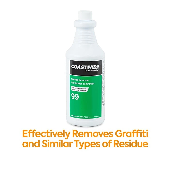 This Coastwide Professional graffiti remover 99 is perfect Use on surfaces of metal, brick, concrete, Formica, and fiberglass. Come in bulk packaging that includes six .95 liter bottles with pleasant odor. Bottles are ready to use what makes cleaning faster. Contains no acetone, methylene chloride, toluene, methanol, acids or other hazardous solvents.
