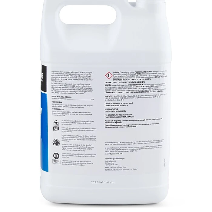 Coastwide Professional powerful, multipurpose glass and surface cleaner is highly concentrated and cleans a variety of surfaces, including glass, plastic, countertops and more. Formulated to help protect human and environmental health without sacrificing performance. Use this glass cleaner to quickly and easily remove grease, film, grime, finger marks, smudges and other unwanted residues without streaking or smearing.