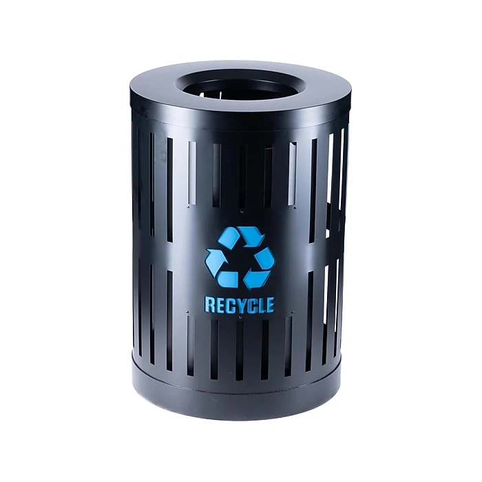 - Made of metal in an upscale matte black finish that conceals blemishes from heavy use with a blue recycling logo