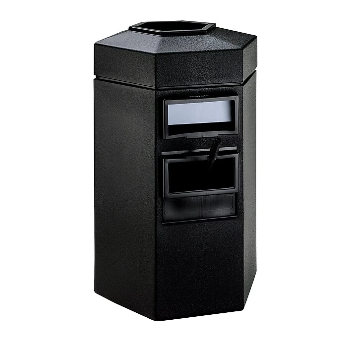 The black, Bermuda 1 Waste Container and Windshield Service Center combines a generous 45-gallon trash capacity with the convenience of a built-in windshield service center. The unique hexagon shape is great for pump-island areas with limited space. The waste container includes a patented Grab Bag system that secures trash bag in place and is also molded from long-lasting polyethylene that won’t rust, dent or chip. The standard size towel dispenser accommodates 1- or 2-ply folded paper towels (suggested towel size: 10 x 10).