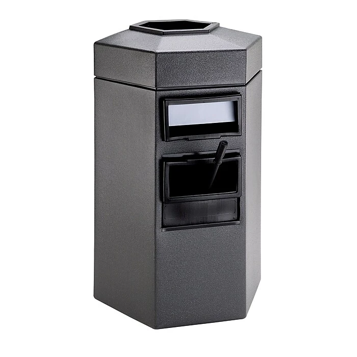 The charcoal, Bermuda 1 Waste Container and Windshield Service Center combines a generous 45 gallon trash capacity with the convenience of a built in windshield service center. Unique hexagon shape is great for pump-island areas with limited space. Waste container includes patented Grab Bag system that secures trash bag in place and is also molded from long-lasting polyethylene that won’t rust, dent or chip. Standard size towel dispenser accommodates 1 or 2-ply folded paper towels (suggested towel size: 10 x 10).