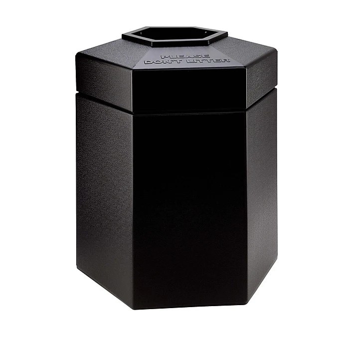 The black, PolyTec Series 45 Gallon Hex Waste Container has a unique, stream lined appearance that offers a larger capacity and convenient ease of use. The patented Grab Bag system secures the trash bag in place for a cleaner appearance with a decreased chance of the lid blowing off. These heavy duty waste containers are designed to withstand the harshest environments as well as offer easy maintenance. Environmentally friendly containers are molded from long-lasting recycled polyethylene. They won’t rust, dent or chip.