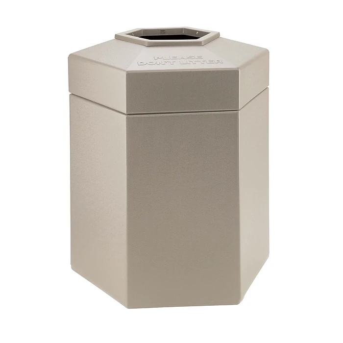 The beige PolyTec Series 45 gallon Hex waste container has a unique, streamlined appearance that offers a larger capacity and convenient use. The patented Grab Bag system secures the trash bag in place for a cleaner appearance with a decreased chance of the lid blowing off. These heavy-duty waste containers are designed to withstand the harshest environments, as well as offer easy maintenance. The environmentally friendly containers are molded from long-lasting recycled polyethylene. They won’t rust, dent or chip.