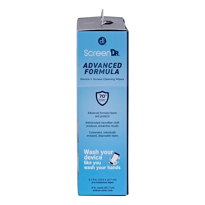 The 120-count Digital Innovations Screen Dr Advanced Formula wet wipes are 6″ x 5″ individually-wrapped, pre-moistened disposable wet wipes. These wipes contain 70% alcohol and are made in the USA. Also included is one 8″ round microfiber cloth that has been treated with antimicrobial agents for product protection and is machine washable.
