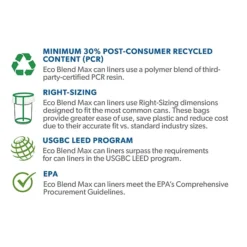 The Eco Blend Max can liners are engineered to reduce the waste destined for landfills. That is why Eco Blend Max strives to use recycled content in its can liners, to replace virgin plastic with material recovered from the waste stream. This Eco Blend Max can liner uses rightsizing dimensions designed to fit most common cans.