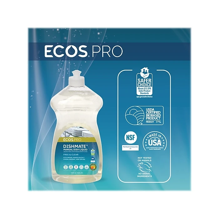 This highly effective ECOS PRO Dishmate manual dishwashing liquid cleans and cuts grease without drying out skin. The unique formulation leaves less residue on dishes for a quicker rinse time and reduction in water usage. The hypoallergenic, pH-balanced formula is made using sustainable, plant-derived surfactants. The product is free of dyes; gray water and septic safe.