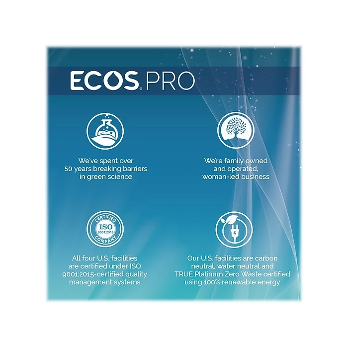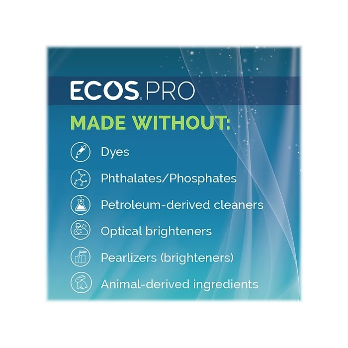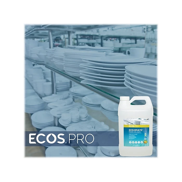The highly effective ECOS PRO Dishmate manual dish detergent cleans and cuts grease without drying out skin. The unique formula leaves less residue on dishes for quicker rinsing and reduction in water usage. The dish detergent is pH-balanced and hypoallergenic, made from sustainable, plant-derived surfactants. The product is free of dyes; gray water and septic safe.