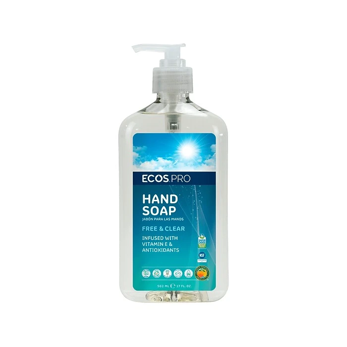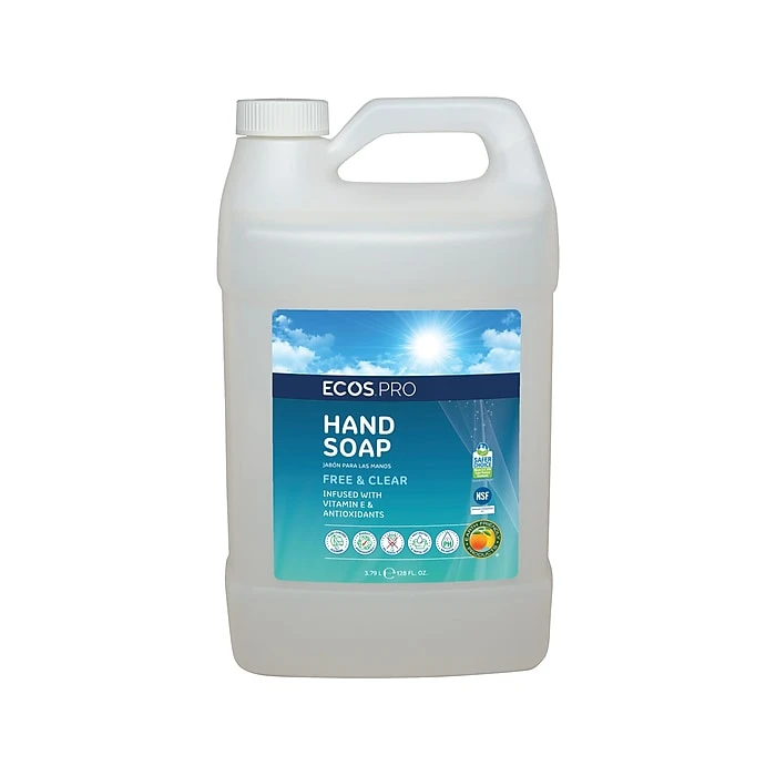 Crystal clear plant-powered ECOS PRO hand soaps are formulated to lift dirt and grease, but gentle enough for even the most frequently washed hands. Infused with nourishing vitamin E and antioxidant. Hand soap moisturizes while protecting hands. A readily biodegradable pH-balanced formula is made using sustainable, plant-powered ingredients. Made without dyes; gray water and septic safe. Recognized by the US EPA’s Safer Choice (DfE) and USDA’s BioPreferred program.