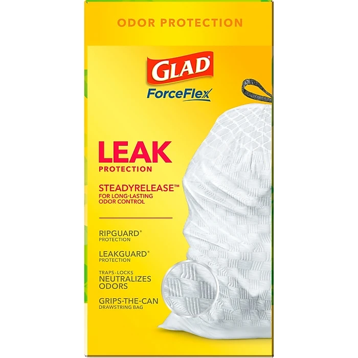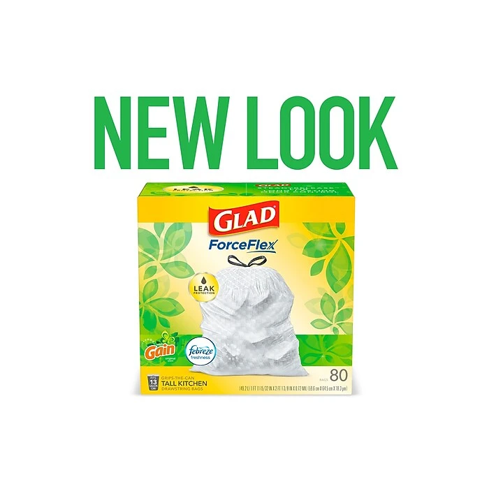 Fight nasty kitchen odors with Glad® trash bags and the steady release of Febreze freshness. Glad® Tall Kitchen Drawstring Trash Bags are designed with ForceFlex technology to give extra flex as it expands around sharp edges and heavy loads, so you can pack it in while resisting tears, rips and punctures. A steady release a Gain Original scent with Febreze Freshness keeps your kitchen pleasantly fresh smelling with long lasting odor control. Let the stretchable strength of Glad® handle all the messes our busy daily life can throw at it and then some. With double-sided seals and a reinforced bottom, these bags are designed with RipGuard® and LeakGuard® technology to prevent seepage of liquids and keep trash contained. The durable Grips-The-Can Drawstring ensures a tight grip on the trash can to keep it in place. Take the trash to the curb with no fear of leaks and tears, and no frustration. Keep your kitchen smelling clean with the stretchable strength of Glad®. Ideal for use in offices, schools, daycare centers, restaurants, hotels and other commercial facilities.