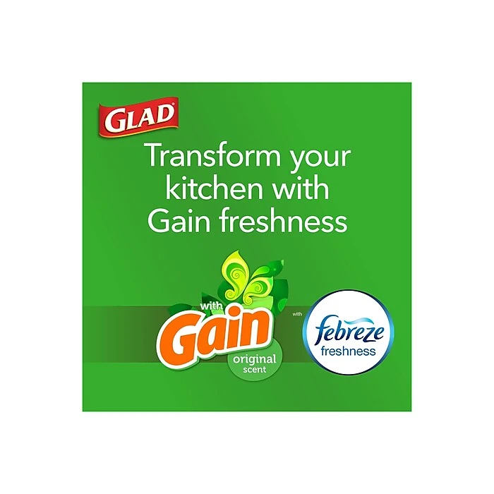 - 13 GALLON PLASTIC TRASH BAGS: Glad® Tall Kitchen Drawstring Trash Bags with stretchable strength, traps, locks and neutralizes odors to keep your kitchen smelling fresh with a Gain Original scent; Packaging may vary
