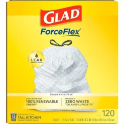 These tall kitchen garbage bags are a more sustainable choice. The bags are made with 100% renewable energy in a zero waste to landfill facility ā that means that 90% of our waste gets recycled or repurposed and 10% or less gets sent to a waste-to-energy facility. Hereās something cool: if everyone in the U.S. chose GladĀ® drawstring trash bags, it would save 100 million pounds of plastic from going into landfills every year. GladĀ® tall kitchen trash bags are designed with ForceFlex technology to give extra flex as it expands around sharp edges and heavy loads, so you can pack it in without ripping. These dual-layered garbage bags feature leak protection technology to resist punctures, rips and tears and the seepage of liquids. Let the stretchable strength of GladĀ® handle all the messes our busy daily life can throw at it and then some. The durable Grips-The-Can Drawstring ensures that the bag stays in place, and provides a sturdy 3-ply handle, making it easy to lift, carry and toss the bag. Tough and resilient, GladĀ® can handle some abuse, so shake the trash deeper into the bag while keeping everything contained. Take on trash with the confidence of GladĀ®.